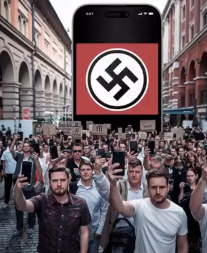 La imagen es perturbadora. Denuncia cómo los algoritmos pueden resucitar ideologías de odio y reabrir las heridas más oscuras de la historia. La obra transmite además una desconexión de la realidad física en favor de la validación virtual a través del smartphone, un «tótem» del que las personas consumen su veneno.