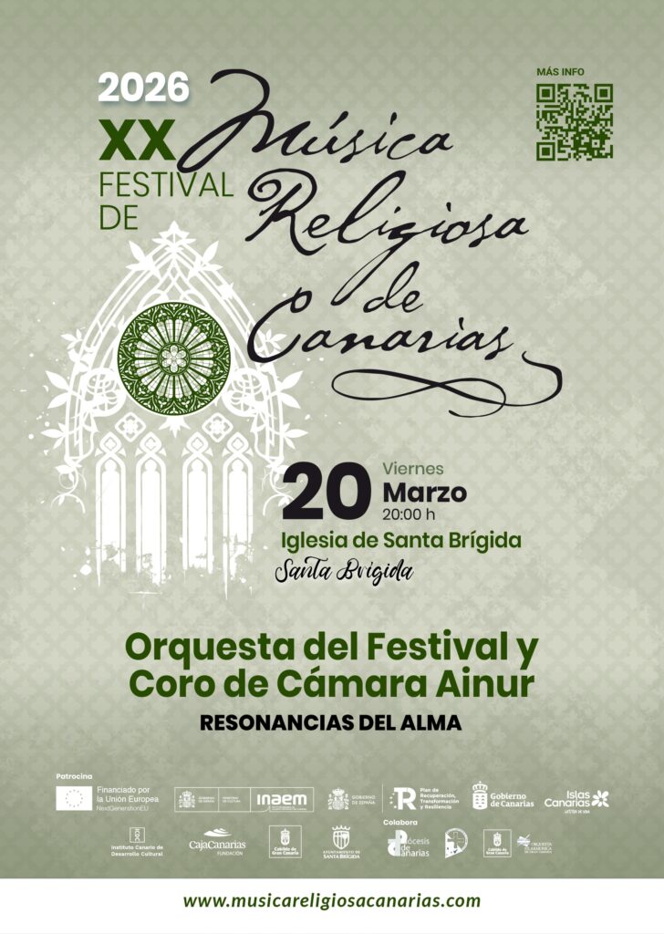 El Festival de Música Religiosa de Canarias celebra 20 años con 16 conciertos distribuidos en varias islas. La cita en Santa Brígida se integra en la programación cultural del mes de marzo del Ayuntamiento de Santa Brígida y cuenta con el patrocinio del Gobierno de Canarias, así como de Promotur Turismo de Canarias. Además, recibe el apoyo del Instituto Nacional de las Artes Escénicas y de la Música., el Cabildo de Gran Canaria, así como las diócesis canarias y la Fundación CajaCanarias.