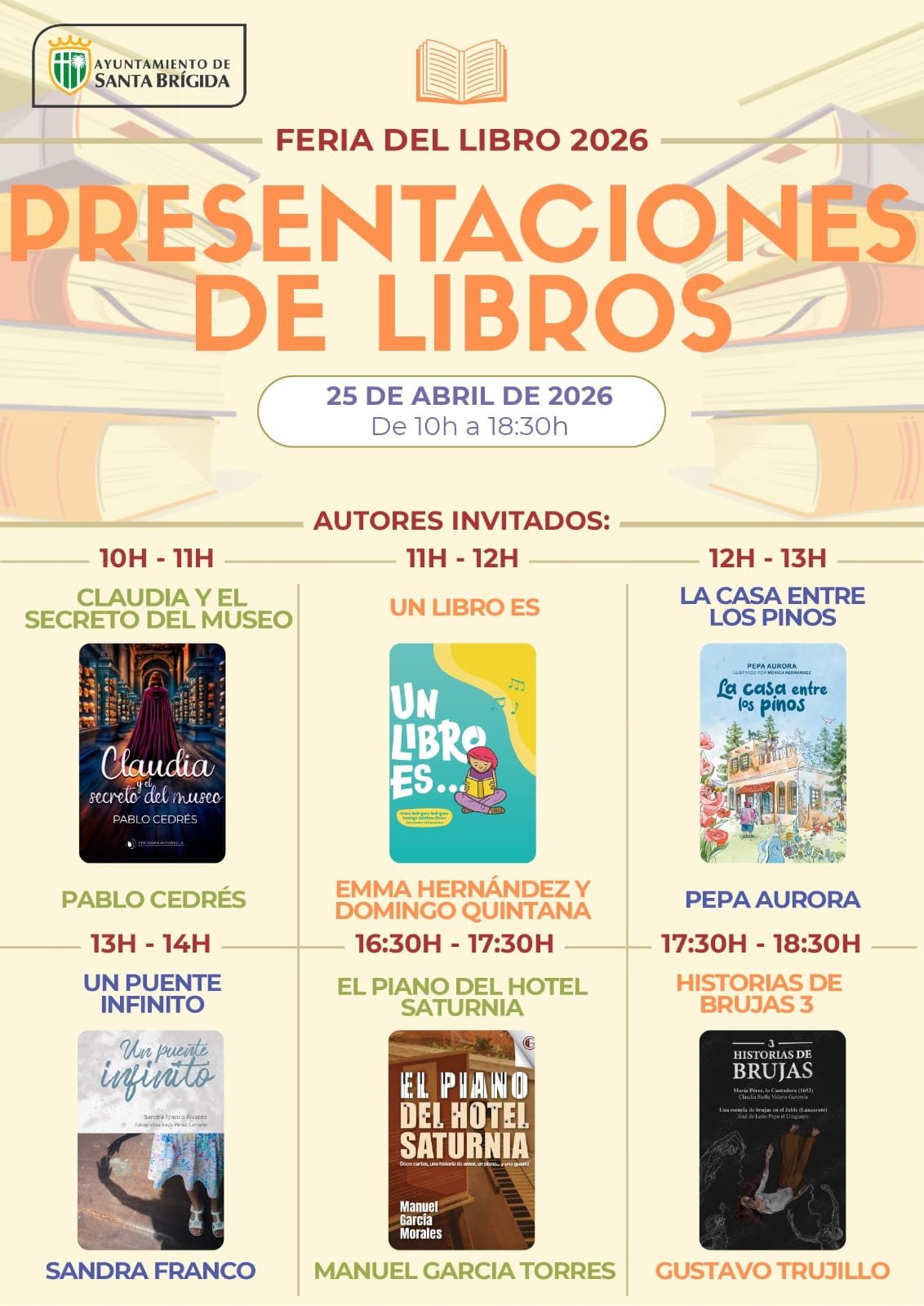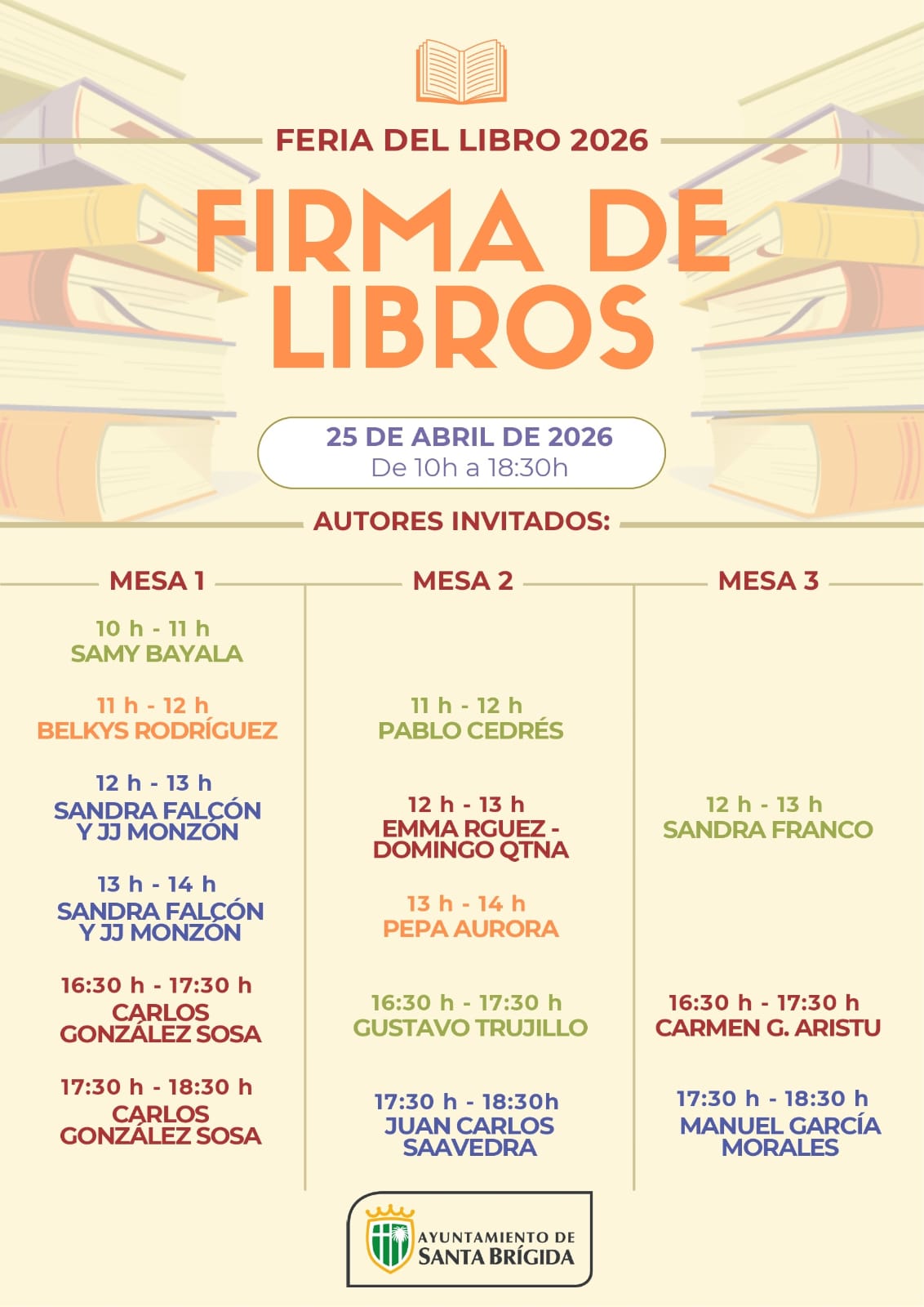 El Ayuntamiento de Santa Brígida invita a la ciudadanía a disfrutar este sábado, 25 de abril, de la II Feria del Libro 2026, que se celebrará en el Parque Municipal de la Villa. El espacio se convertirá, entre las 10:00 y las 19:00 horas, en un punto de encuentro para amantes de la lectura, con un programa que incluye presentaciones de autores, firmas de ejemplares y actividades dirigidas a las familias.