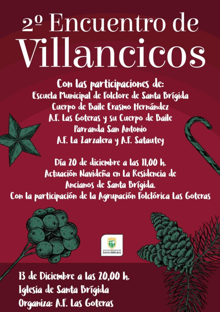 2º Encuentro de Villancicos, un emotivo acto navideño organizado por la Agrupación Folclórica Las Goteras, que reunirá una amplia representación del folclore local: la Escuela Municipal de Folclore, el Cuerpo de Baile Erasmo Hernández, la A.F Las Goteras con su cuerpo de baile, la Parranda de San Antonio, la A.F. La Zarzalera y la A.F. Satautey.