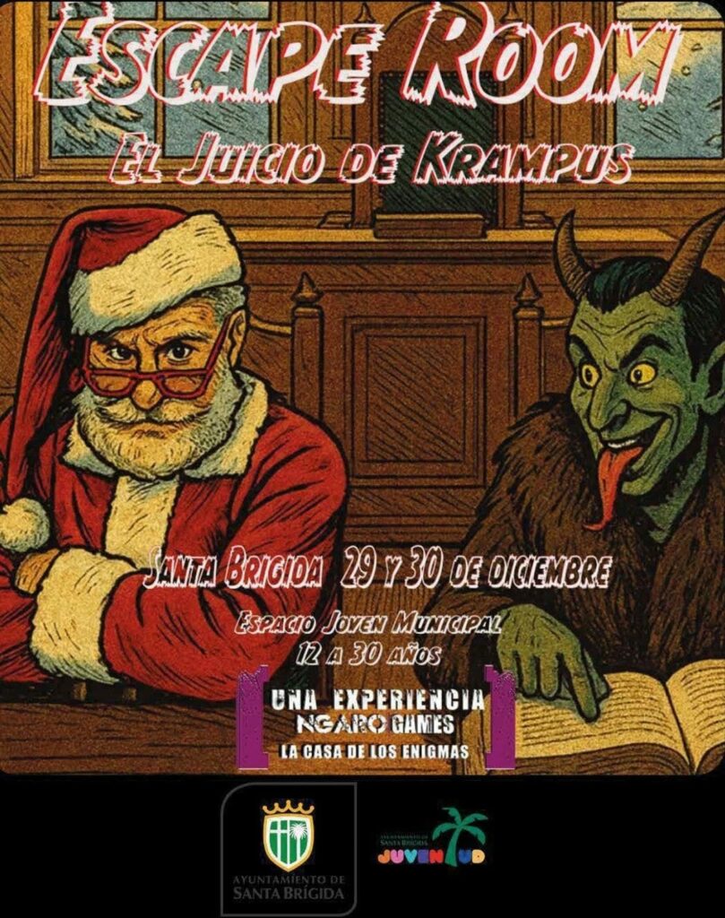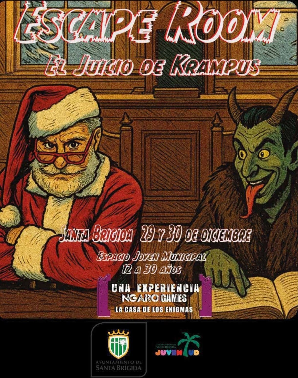 ¡El Espacio Joven Municipal se llena de misterio con el Escape Room El Juicio de Krampus, una aventura intrigante y llena de emoción diseñada para jóvenes de 12 a 30 años de la mano de La Casa de los Enigmas. Habrá dos sesiones en horario de 10:00 a 13:00 h y de 16:00 a 19:30 horas. El programa incluye un enlace oficial de reserva. ¡No dejes que Krampus se escape sin ti!