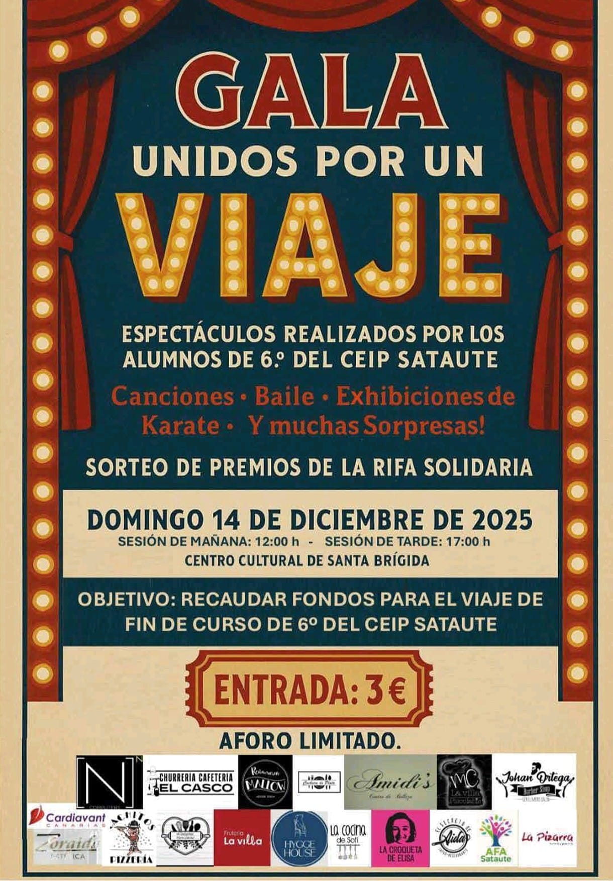 El alumnado del CEIP Sataute nos invita a disfrutar de un espectáculo de música, baile, teatro y muchas sorpresas en la gala Unidos por un viaje, que se celebrará en dos sesiones, a las 12:00 horas y a las 17:00 horas, y su objetivo es recaudar fondos para el viaje de fin de curso de 6º, ¡mientras disfrutamos de una jornada llena de talento!