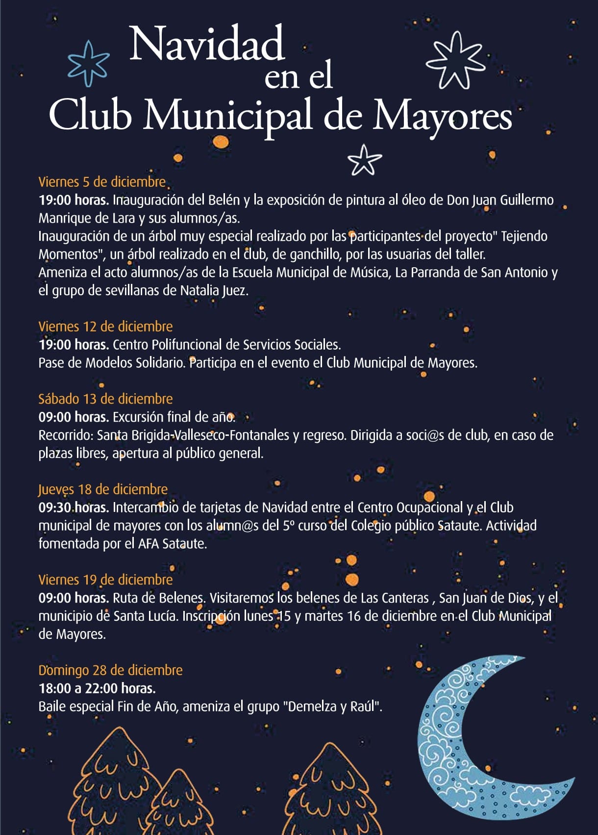 Apertura oficial a las 19:00 horas del Belén del club y una Exposición de pintura al óleo a cargo de Juan Guillermo Manrique de Lara y alumnado. Además, se inaugura un árbol de Navidad muy especial, tejido a ganchillo por las participantes del proyecto Tejiendo Momentos, una obra que simboliza unión, creatividad y dedicación. La velada estará amenizada por alumnos de la Escuela Municipal de Música, La Parranda de San Antonio y un grupo de sevillanas dirigido por Natalia Juez.