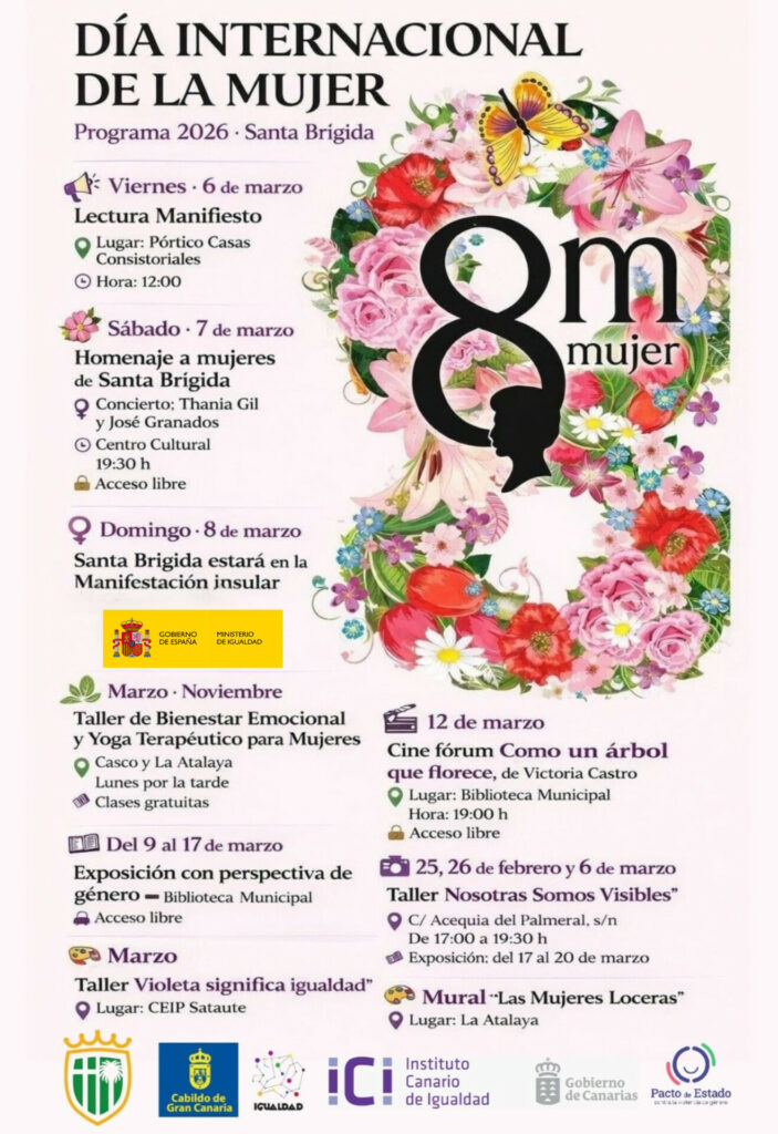 La programación arranca el 6 de marzo con el acto institucional del 8M, que tendrá lugar bajo el pórtico del Ayuntamiento de Santa Brígida, a las 12.00 horas. La lectura del manifiesto a cargo del alcalde, José Armengol.